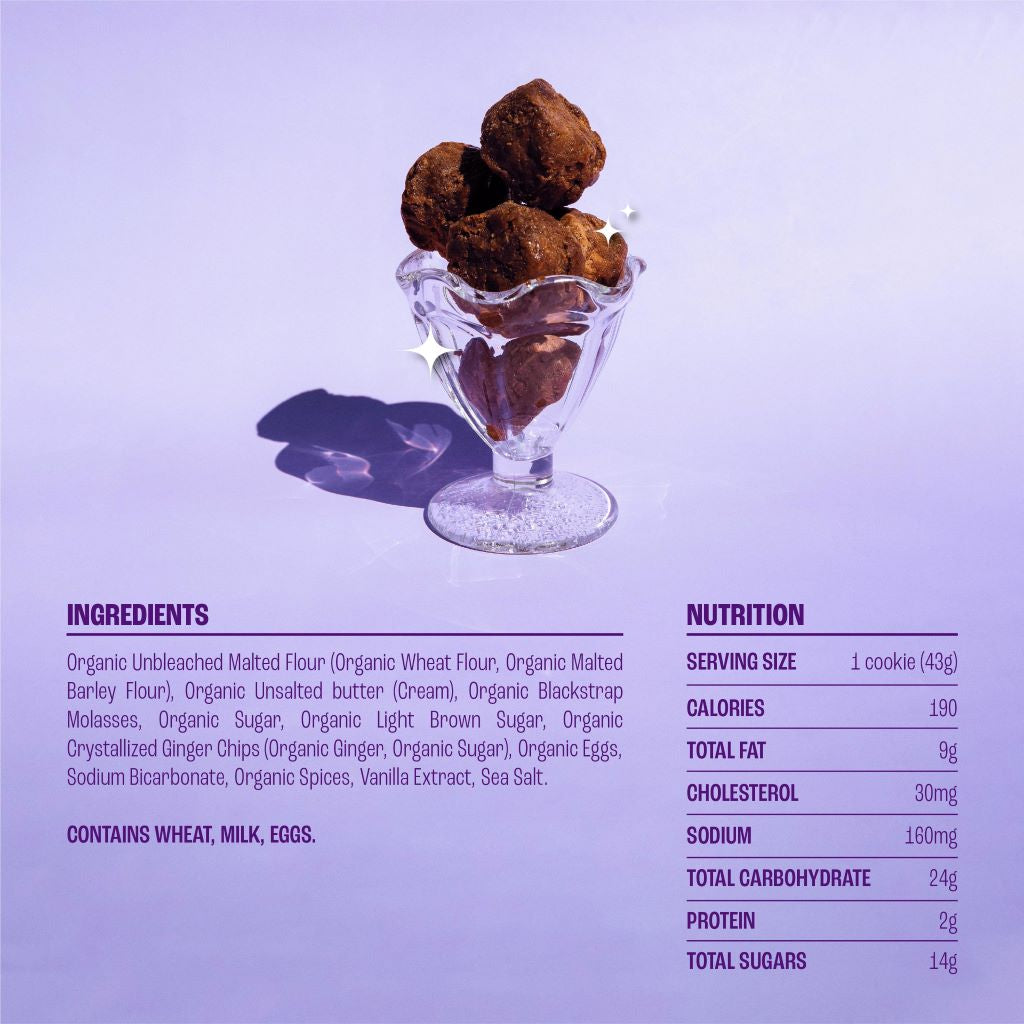 INGREDIENTS: Organic Unbleached Malted Flour, Organic Unsalted Butter (Cream), Organic Blackstrap Molasses, Organic Sugar, Organic Light Brown Sugar, Organic Crystallized Ginger Chips, Organic Eggs, Sodium Bicarbonate, Organic Spices, Vanilla Extract, Sea Salt